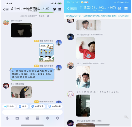 开学第一周,体育课程线上教学有条不紊的进行着。虽然大家都是第一次进入线上课堂,遇到了网络延迟等各种问题,老师们依旧做好了各种预案,沉着应变。第一天课程结束后马上又组织线上分享总结,每一位老师都把自己在课堂上遇到的困难和值得推荐的地方和教研室的每一位老师分享。大家的付出得到了同学们的积极回应。他们的不断创新,不断总结,把体育教育开活开精彩,把体育教育从绿茵操场搬进“网络”, 通过网络接力,运动在学生们居家学习和日常起居中得以充分体现和实践,达到停课不停学,停课不停练, 居家抗疫情,体育运动不打烊的良好效果。