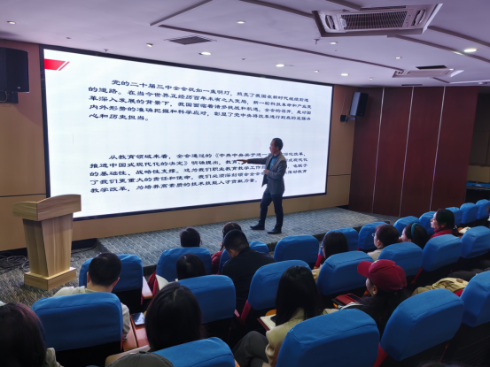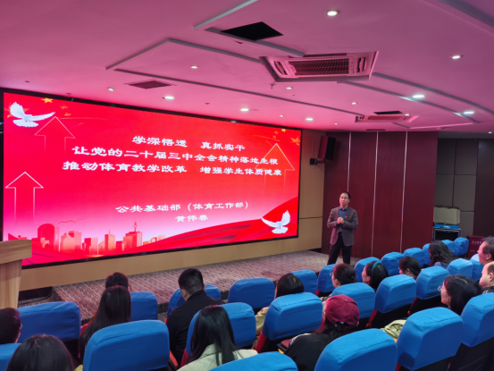 为切实推动学习贯彻党的二十届三中全会精神走深走实、入脑入心,全面贯彻党的教育方针,落实立德树人根本任务,进一步深化教育综合改革,2024年10月15日下午,公共基础部(体育工作部)党委书记黄伟春以“学深悟透 真抓实干 让党的二十届三中全会精神落地生根 推动体育教学改革 增强学生体质健康”为题,为部门全体教师作了一堂生动、深刻的宣讲报告。