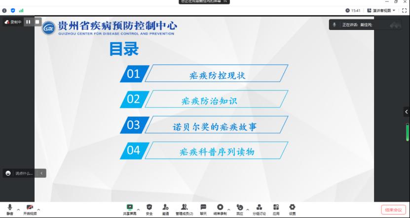 2023年7月2日上午,贵州开放大学护理学网络教学创新团队邀请到贵州省疾病预防控制中心地方病研究所戴佳芮医师,通过腾讯会议,开展主题为“疟疾防控现状和防治知识的讲座”。讲座由护理学专业网络教学创新团队负责人曾珍主持,护理学专业网络教学创新团队成员、开大系统护理学教师和部分学生参加了此次讲座。