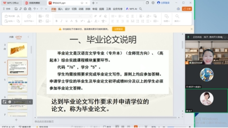 为深入贯彻落实习近平总书记关于教育的重要论述,根据《教育部关于印发〈国家开放大学综合改革方案〉的通知》(教职成〔2020〕6号)和《贵州开放大学创优提质实施方案》,进一步推动贵州开放大学改革发展,提高本专业的教学质量、提供服务社会的创新能力,提高汉语言文学专业(含师范方向)学位论文申报和通过率,汉语言文学专业(含师范方向)团队于2025年4月17日,通过讲座的形式,向本专业教师和学员宣传和介绍毕业实践环节的教学实施安排,通报国开关于学位申请最新政策以及2024年秋季贵州分部汉语言文学学位论文通过情况。